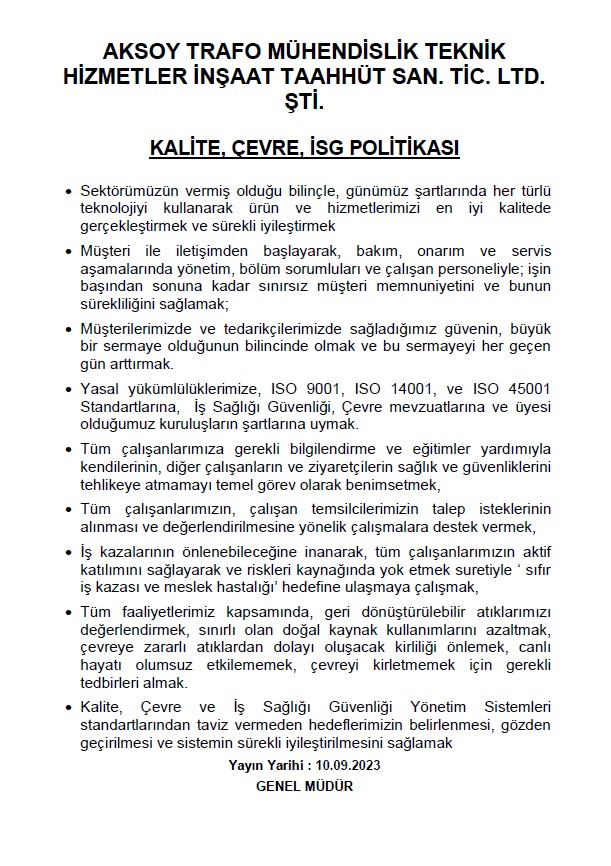 Sahadaki her türlü trafoya yüksek kalitede bakımk hizmeti sunmak,trafo test bakım ve mühendislik hizmeti alanlarında iş imkanı yaratarak ülkemize hizmet etmek, personelimizin sürekli gelişmesini ve güven içinde mutlu çalışmasını sağlamak.